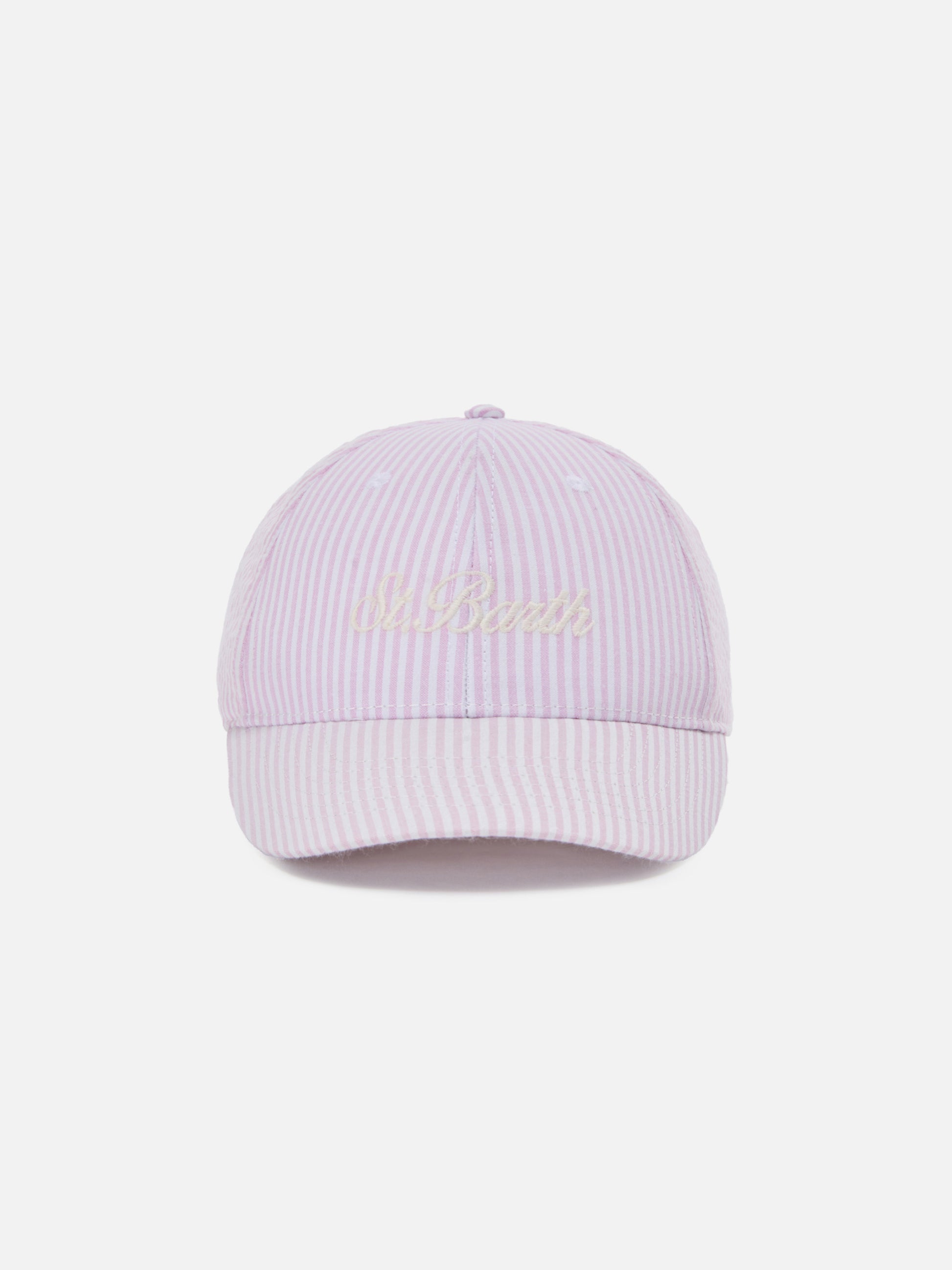 Baseball cap with visor in cotton seersucker with pink and white stripes