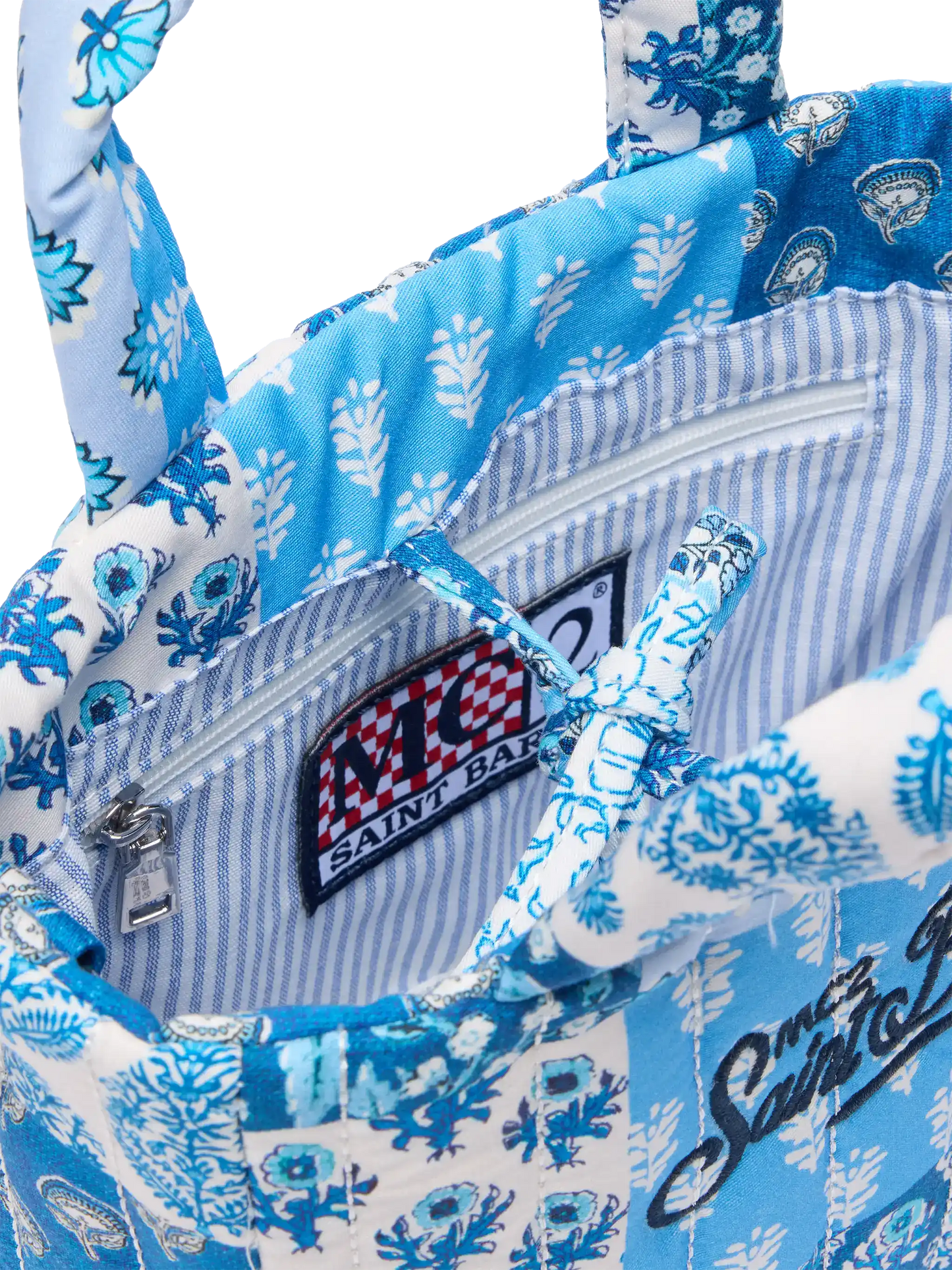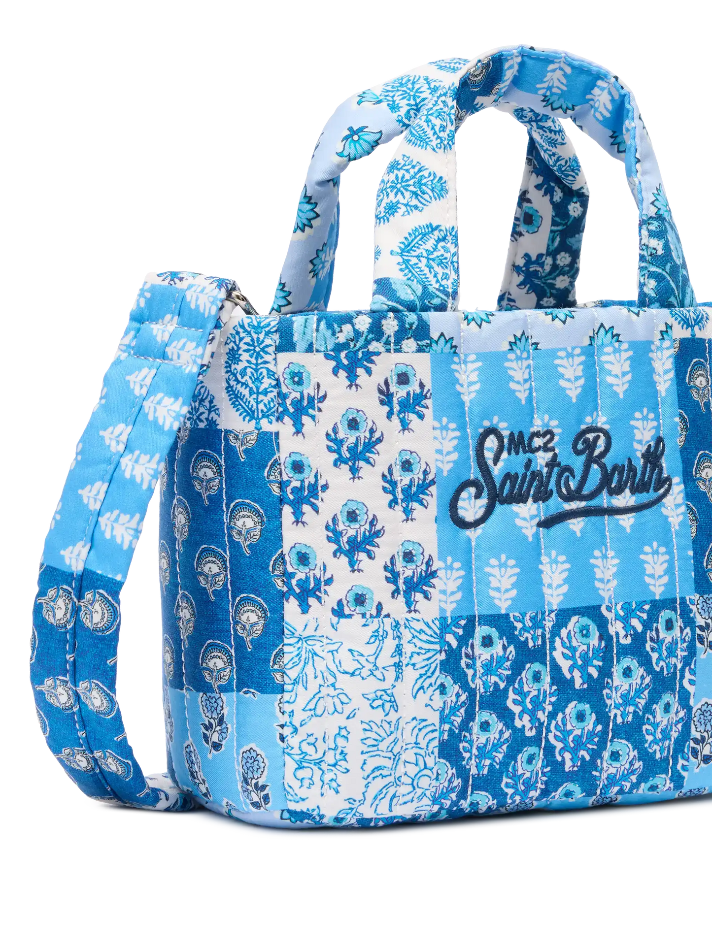 Weiche Mini-Tragetasche mit Steppmuster und blauen Blumen