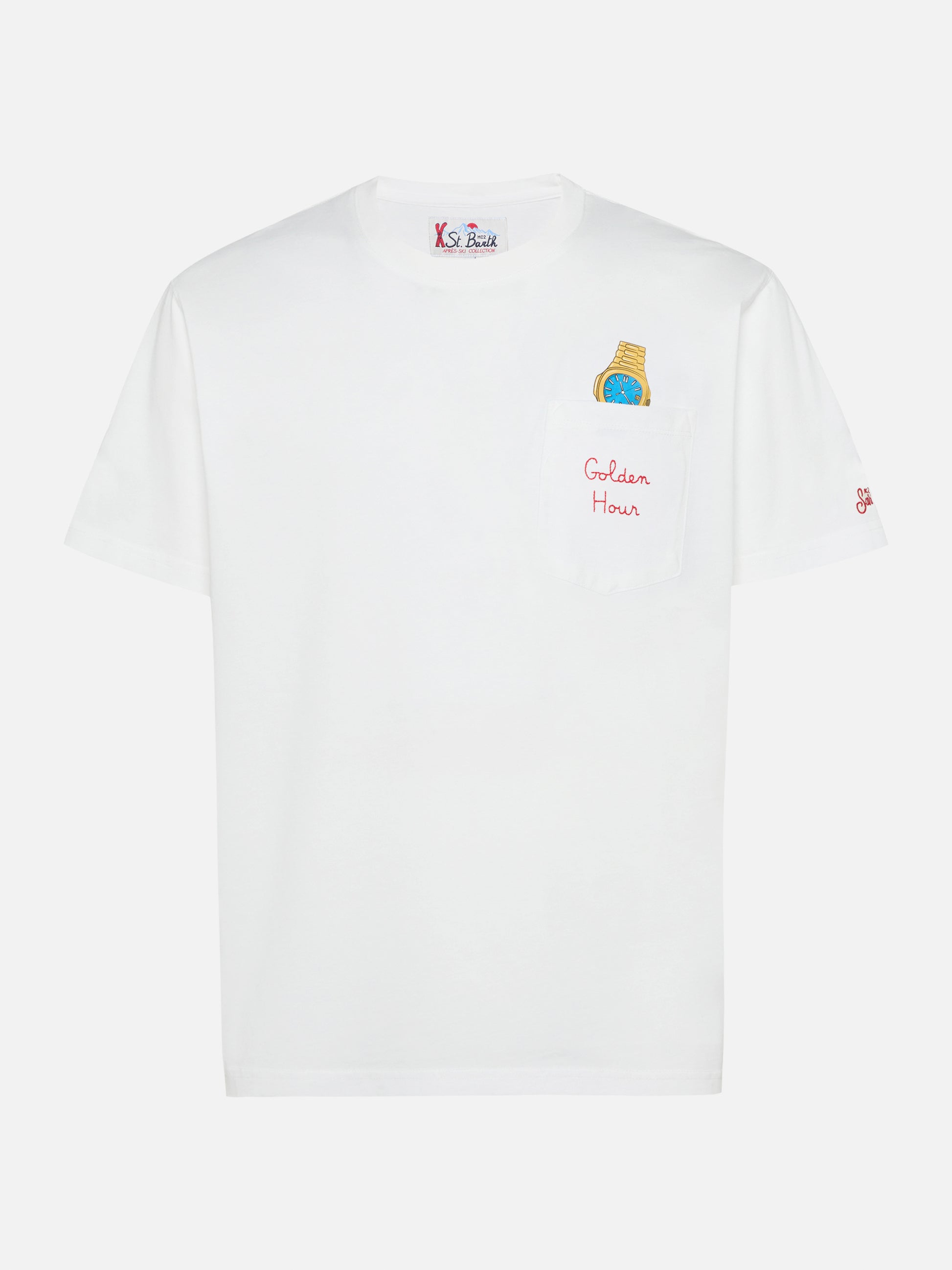 Connor cotton T-shirt in white with Golden hour pocket embroidery