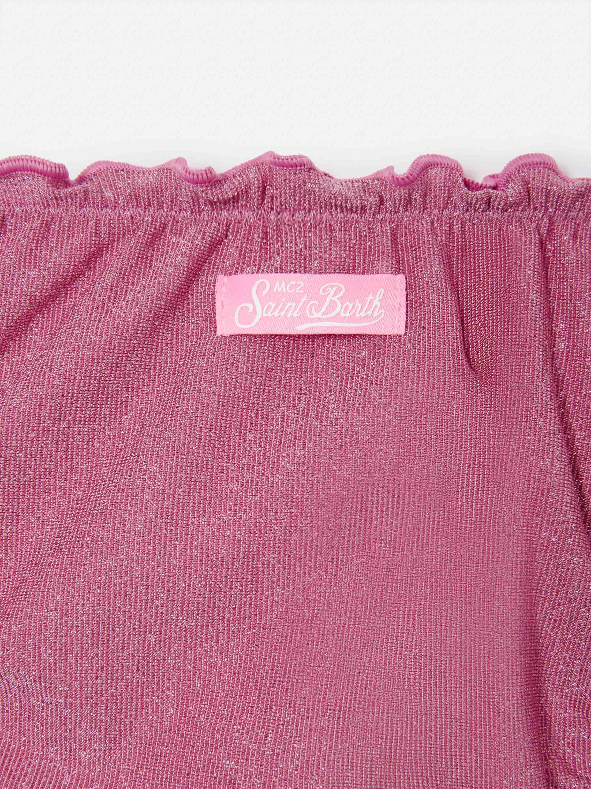 The Cric swim briefs for girls are crafted from solid dark pink stretch lurex fabric. The luminous texture enhances the design with a bold and sparkling finish. The ruffled edges add a playful touch, while the side bows complete the style. The garment is fully lined and offers a slim and comfortable fit.