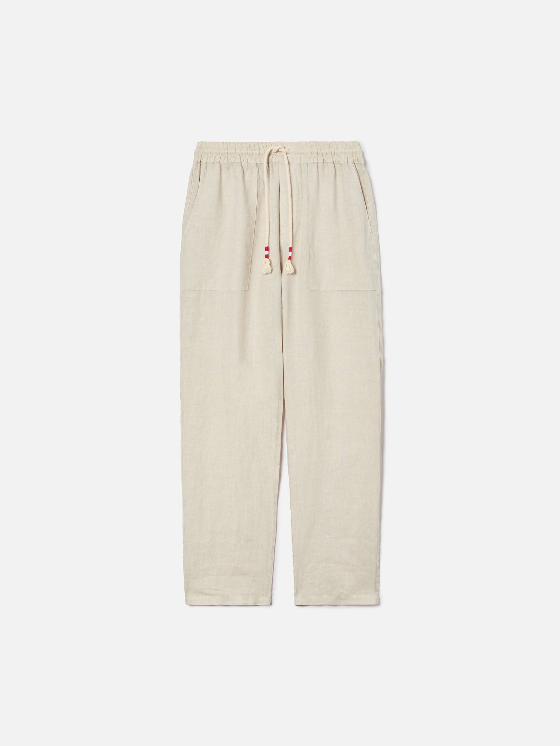 The Calais long pants are crafted from pure linen, a lightweight and breathable fabric designed to offer comfort and ease. The solid color design enhances the clean aesthetic of the style. The elasticated waistband with braided rope drawstring with white-red binding allows easy adjustment of the fit. The style is completed with front slanted pockets, back flap pockets with logo buttons and a logo label applied at the center back of the waistband. The straight leg and relaxed fit ensure comfort and freedom of movement.