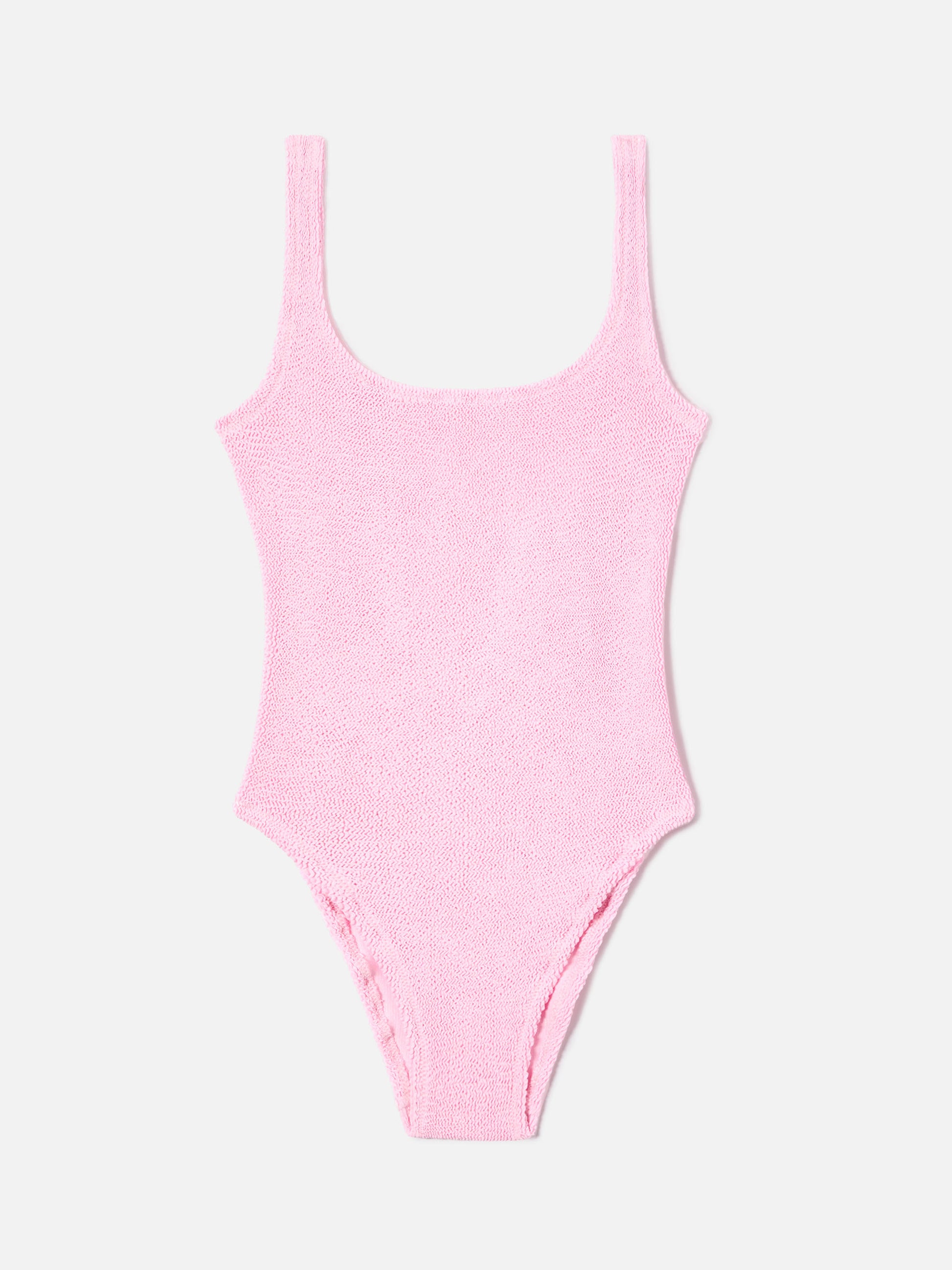 Lora one-piece swimsuit in pink solid color crinkle fabric