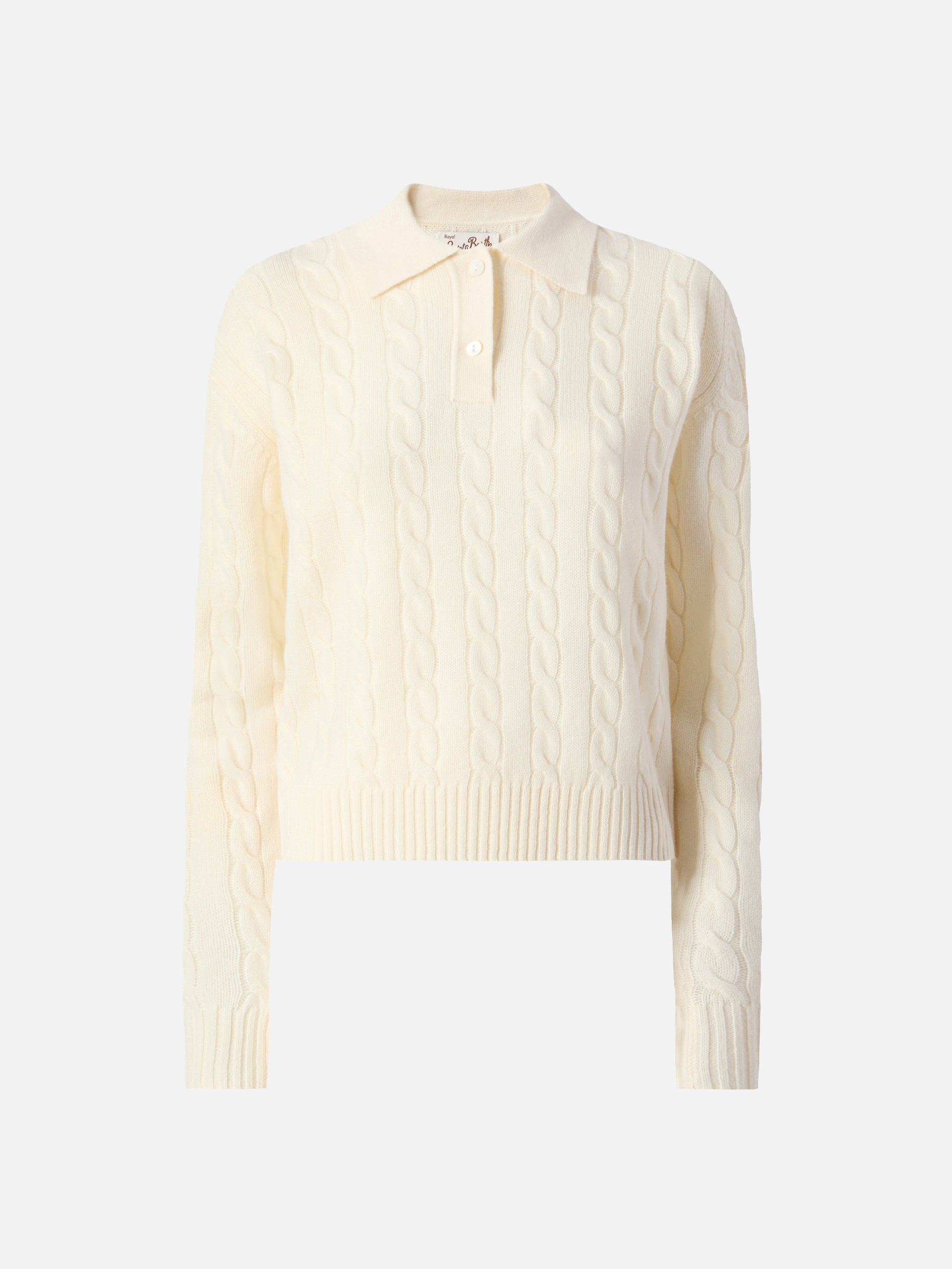 Savoy in white is a contemporary classic: soft cables and a polo silhouette for essential style.