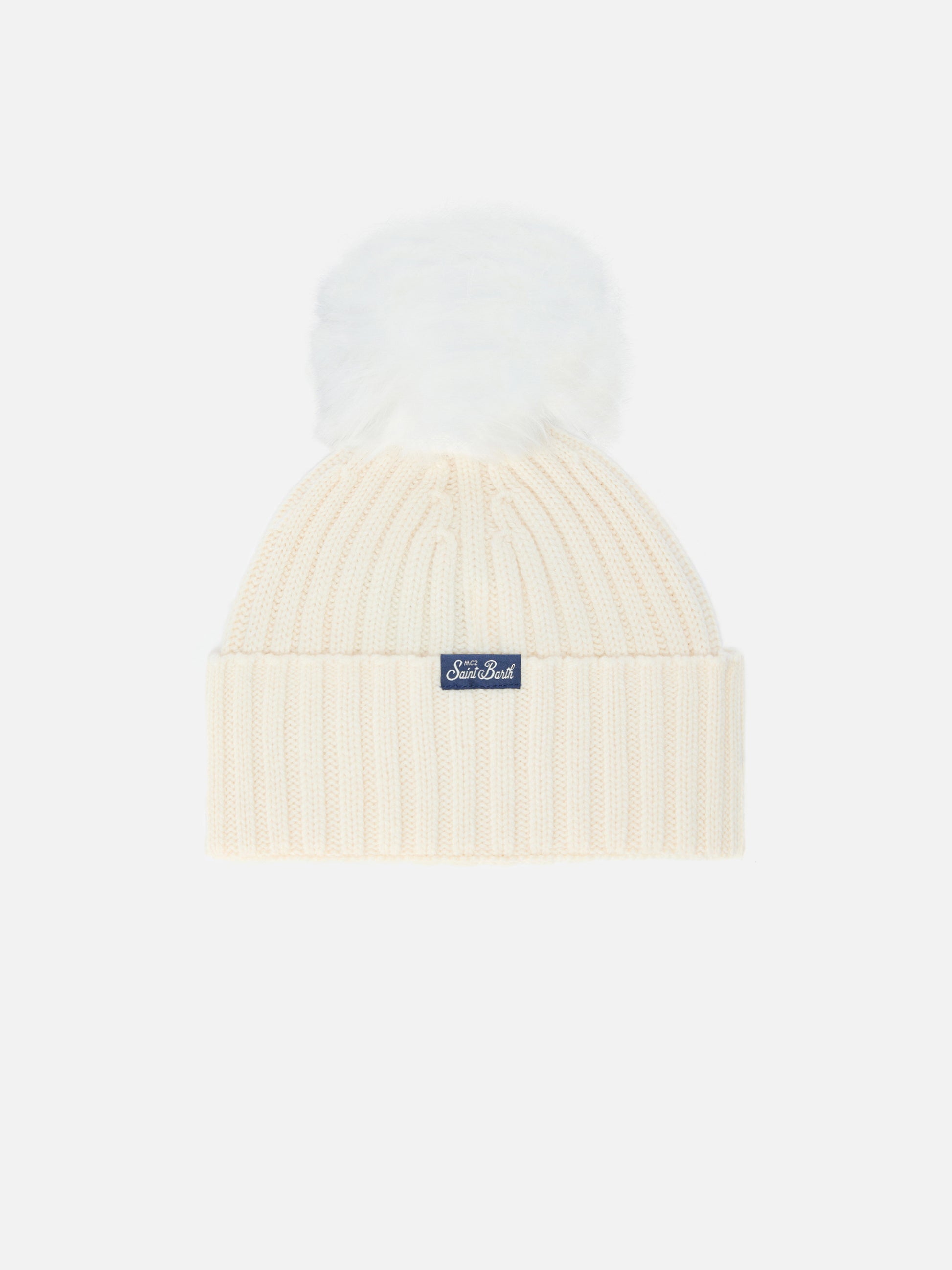 Wengen Jr F beanie in cashmere blend in white with Favolosa embroidery
