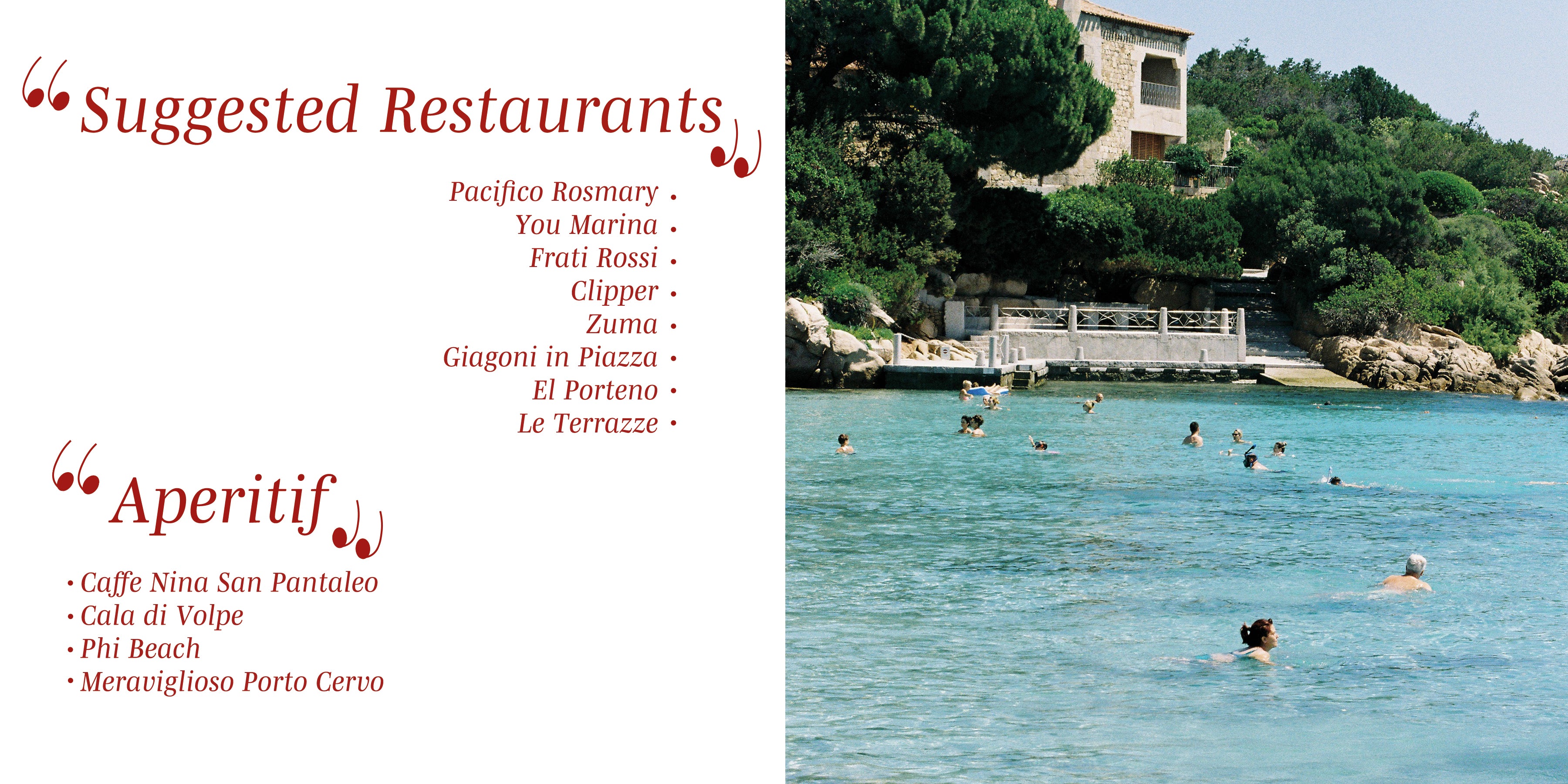 For dining, the Pacifico Rosmary offers a unique atmosphere with the Signani brothers, while You Marina, hosted by Pigio Purini, provides stunning harbor views. Frati Rossi is open all year round, and Giagoni in Piazza in San Pantaleo offers an elegant and romantic dining experience. Clipper, a historic restaurant in Porto Cervo run by the Volpi family, Zuma for an international dining experience, El Porteno for the best Argentine meat, and Le Terrazze for the best fish on the coast with a beautiful terrace view are all excellent choice.