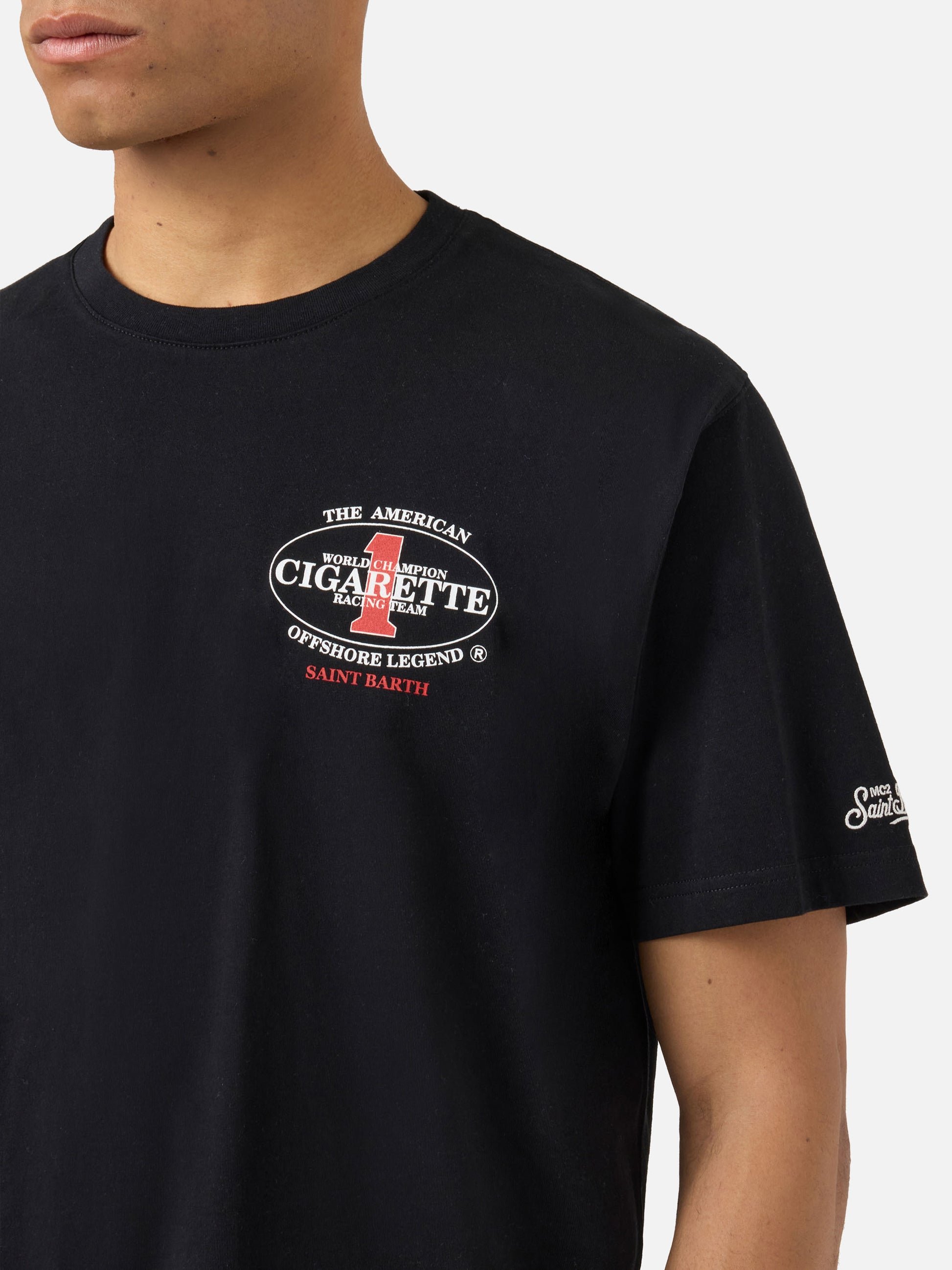 https://it.mc2saintbarth.com/it/products/black-portland-t-shirt-with-cigarette-racing-print-special-edition10777979814234T-shirt Portland nera con stampa Cigarette Racing | Special Edition95,00https:files/UID_PRL000207772L-MAN-T-SHIRT-BLACK-MC2-CIGARETTE-20260410170927_2.jpghttps:files/UID_PRL000207772L-MAN-T-SHIRT-BLACK-MC2-CIGARETTE-20260410170927_2.jpgEURInStockT-SHIRT650948215130All Products - Only Man649134276954AVADA - Best Sellers672847102298Cigarette673823621466Man Maxi Print T-shirts673818575194Man t-shirts673853800794Men Prints and Embroidery288164774072T-Shirt Uomo654690484570UpSelling_Man_T-shirtsLa t-shirt Portland è realizzata in puro cotone, progettata per offrire comfort e una sensazione naturale sulla pelle. Il design nero tinta unita valorizza la costruzione essenziale del capo. Il modello in Edizione Speciale Cigarette Racing presenta una stampa logo sul petto, mentre sul retro è arricchito da una maxi grafica con il logo Cigarette Racing Team e lettering Offshore Legend Saint Barth. Il capo è rifinito con ricamo logo sulla manica, scollo a girocollo, maniche corte e linea dritta con vestibilità regolare.