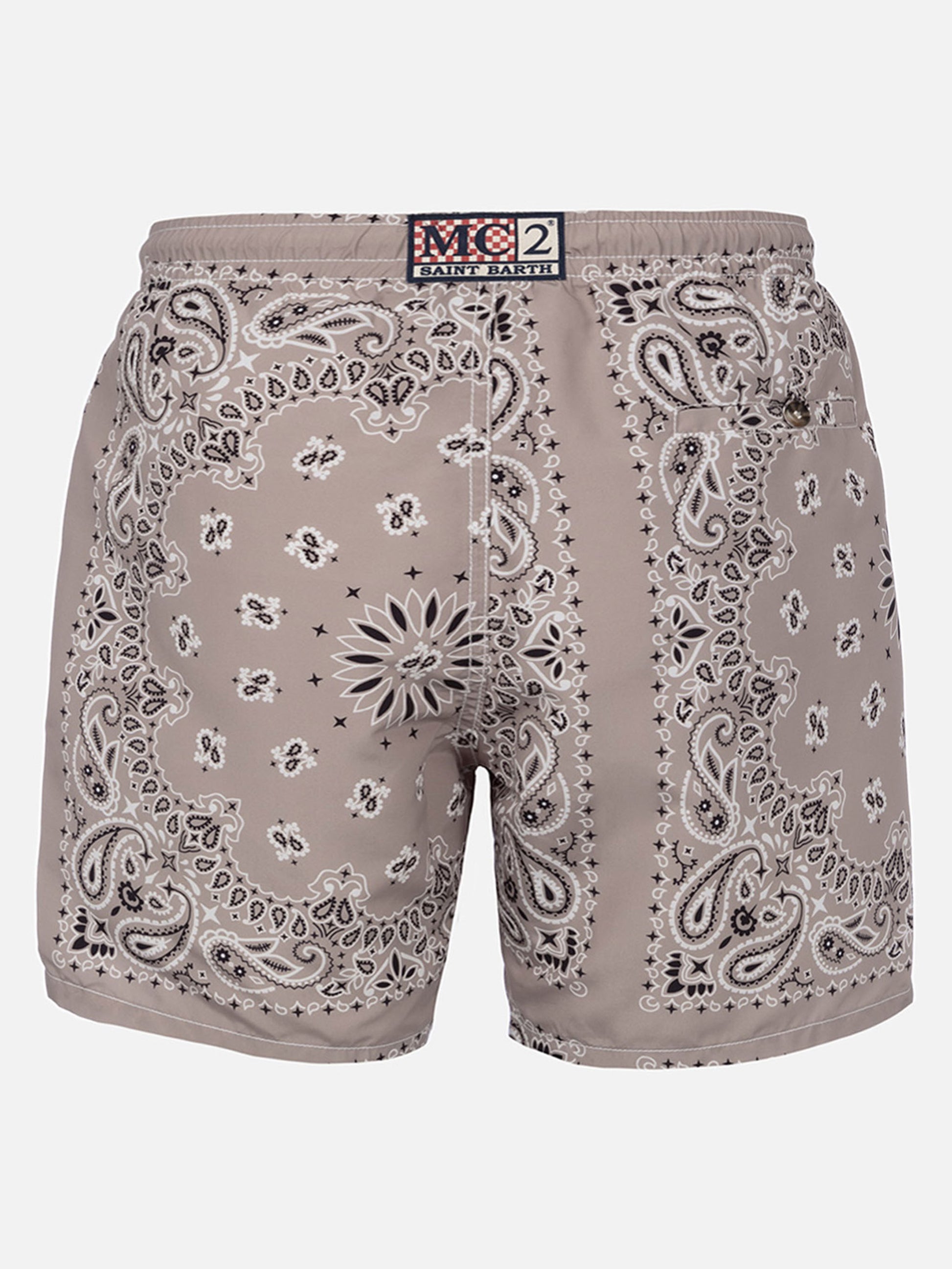 Tessuto pesca intrecciato a mano Stampa all-over bandana beige Vita elasticizzata per un maggiore comfort Coulisse regolabile effetto corda Slip interno in rete Tasche laterali con cuciture alla francese Tasca posteriore con chiusura a bottone Micro tasca a filetto sul davanti a destra