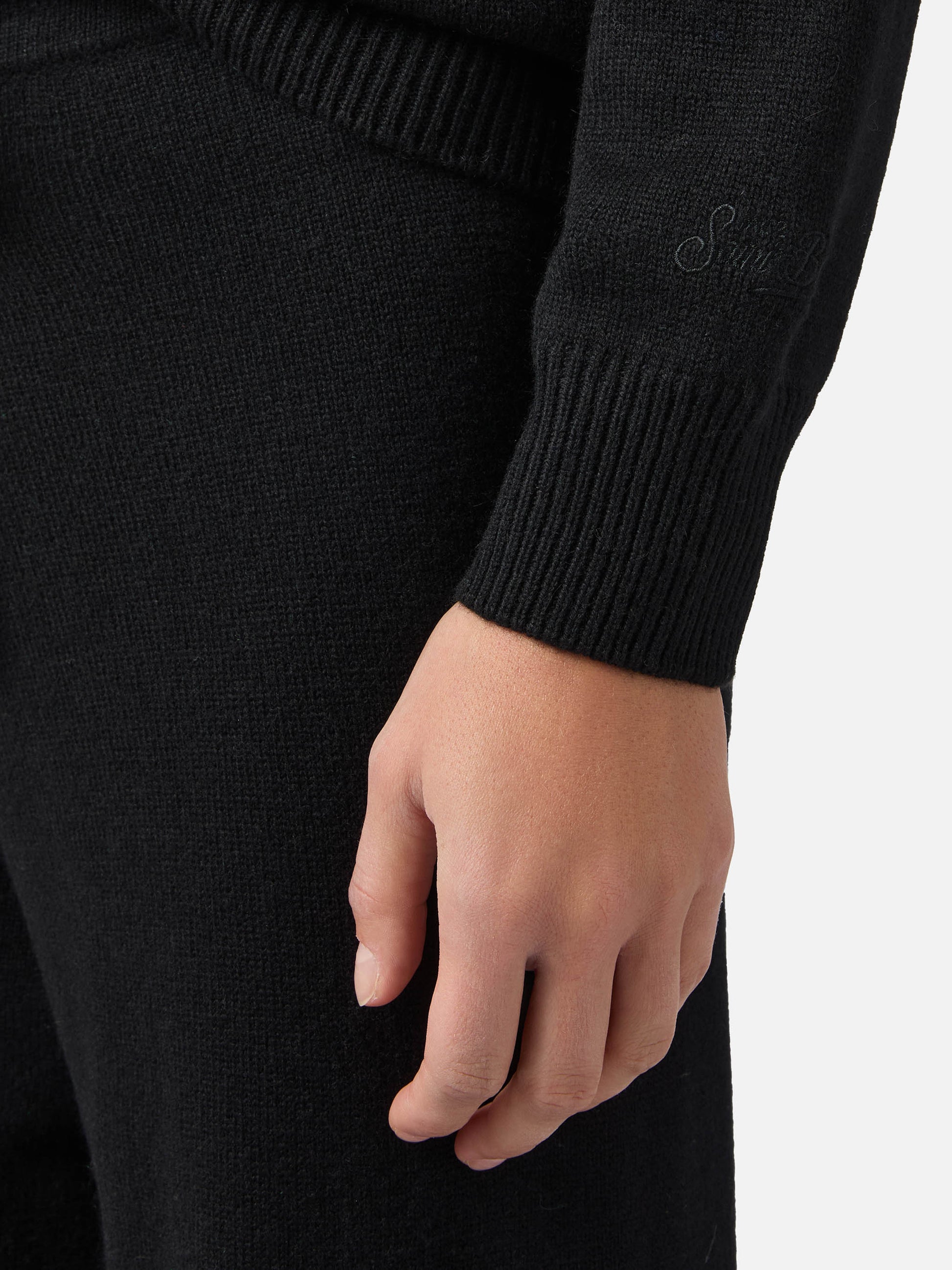 Maglione New Queen in misto cashmere nero con ricamo Bollicine, please