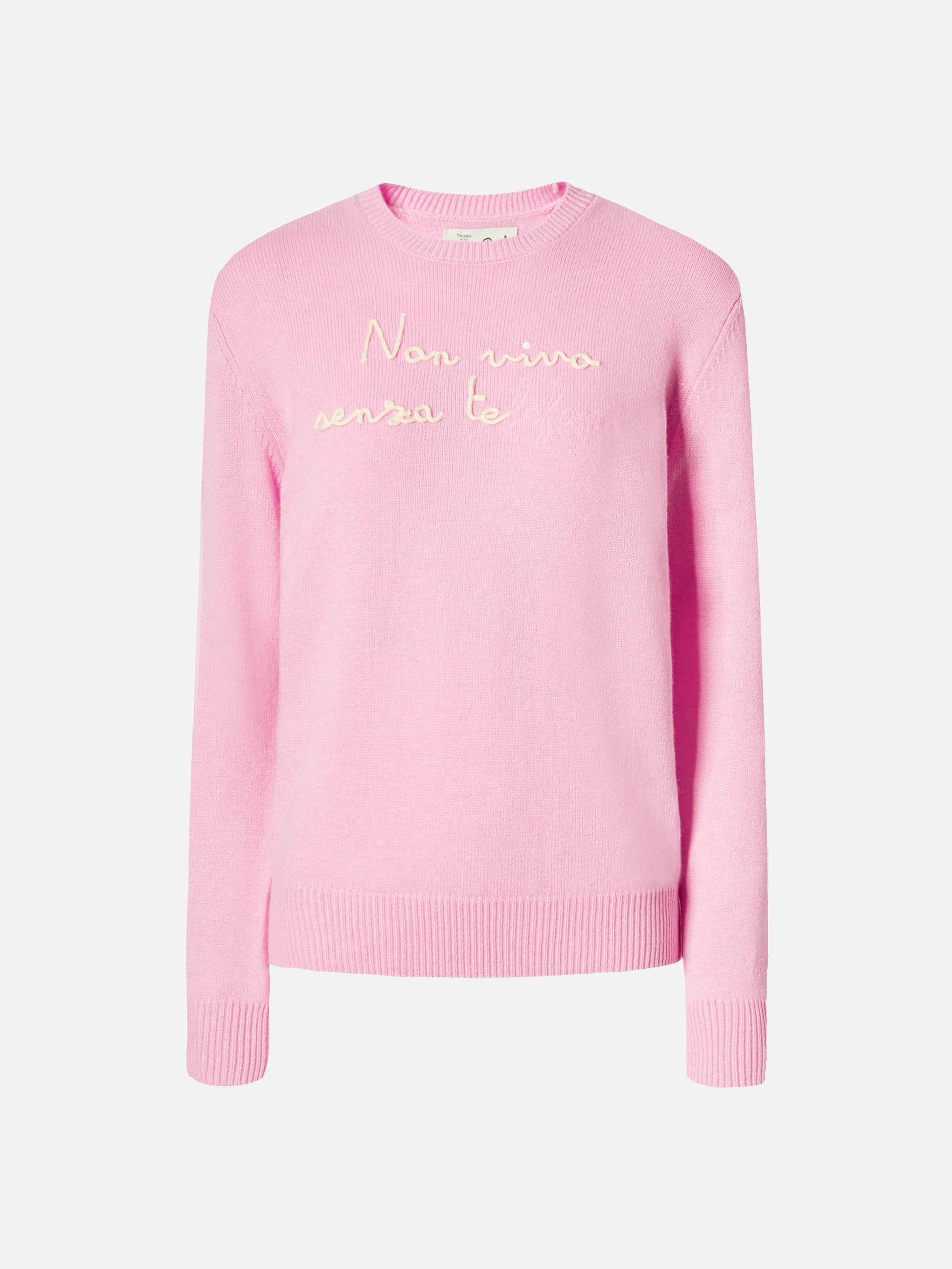 Maglione New Queen in misto cashmere rosa con ricamo Non vivo senza te(lefono)