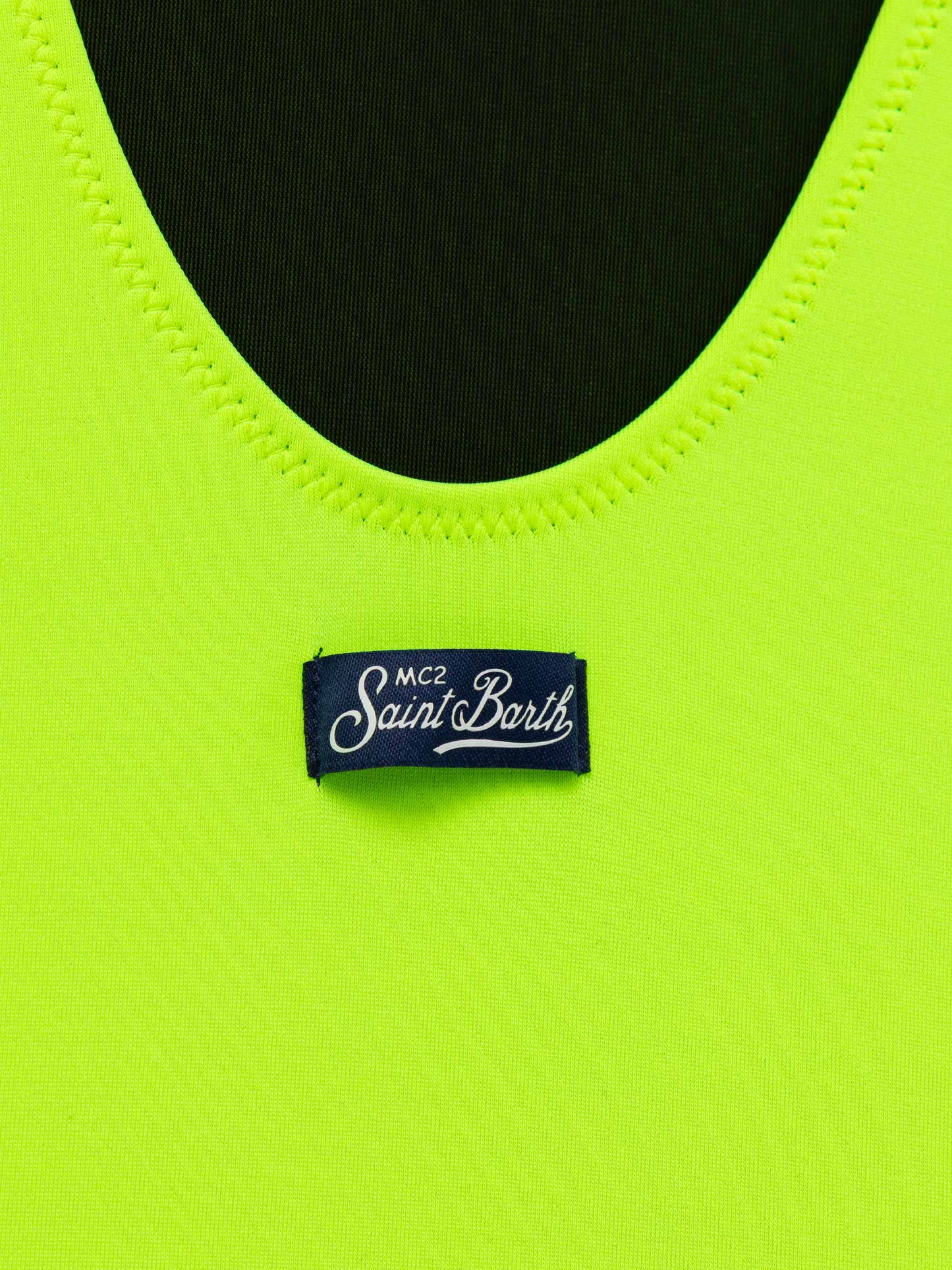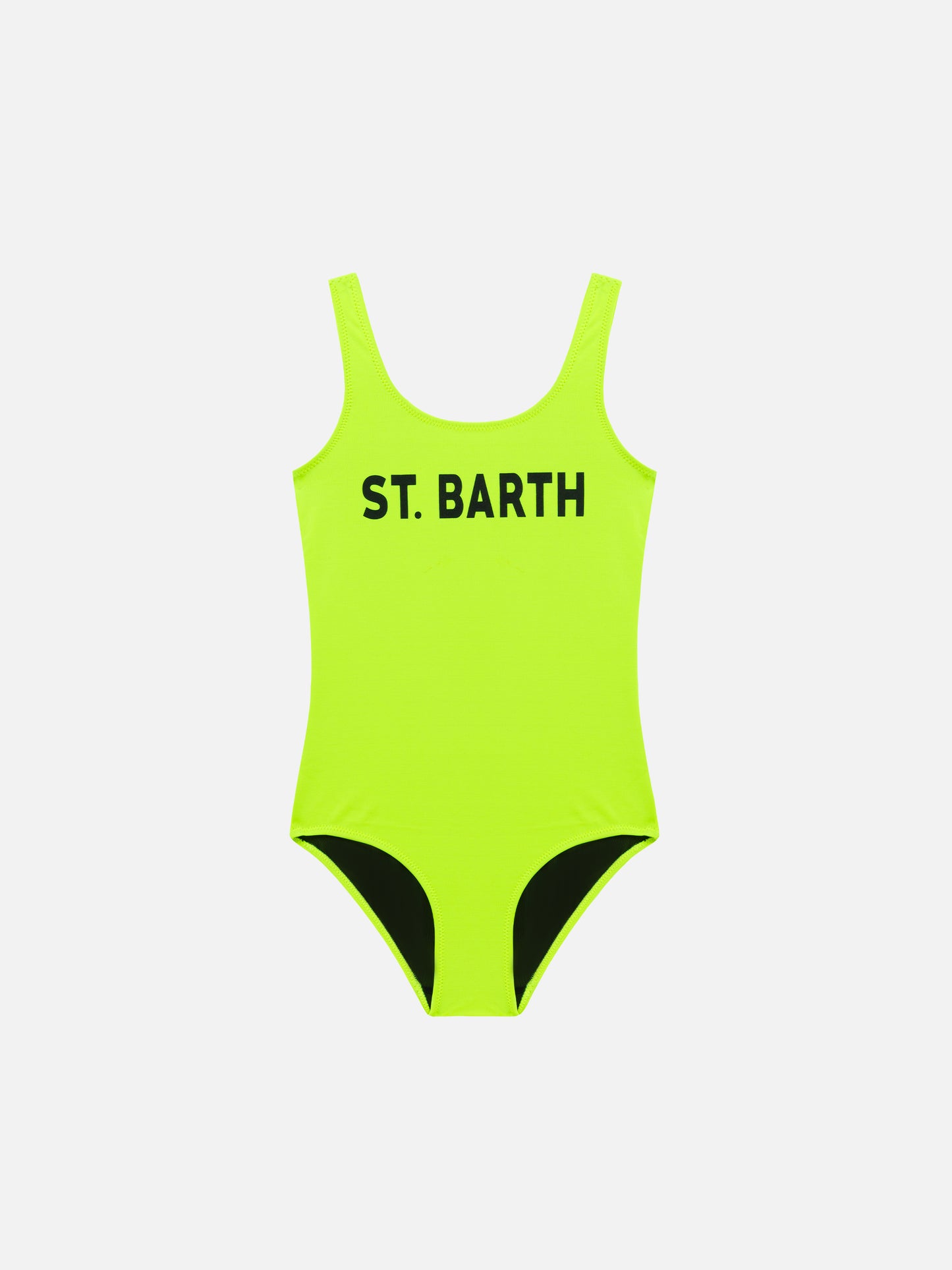 Costume intero da bambina , tinta unita giallo fluo, grafica St. Barth frontale, girocollo , vestibilità slim tretch. Composizione: 90% Poliammide 10% Elastan e.