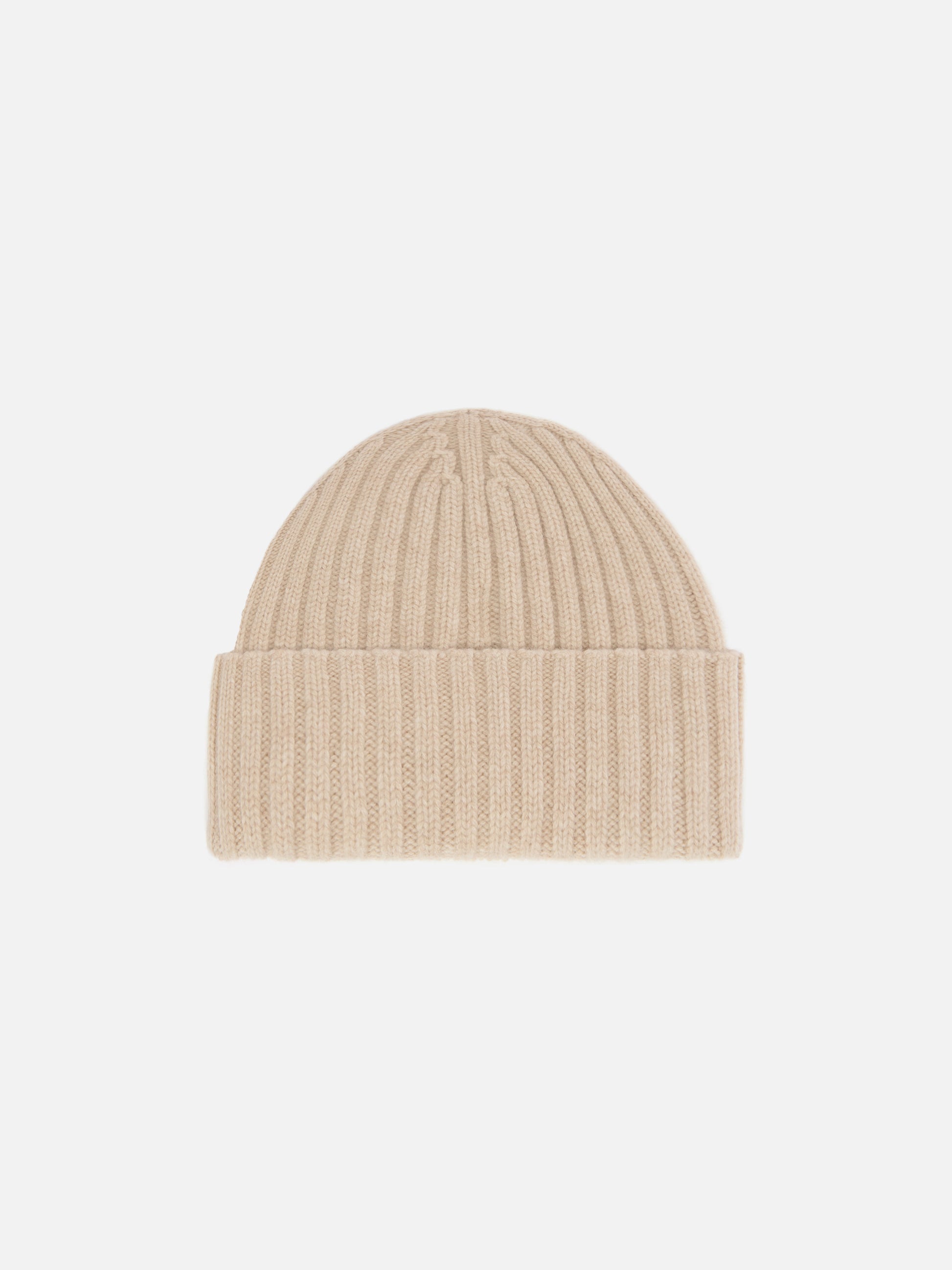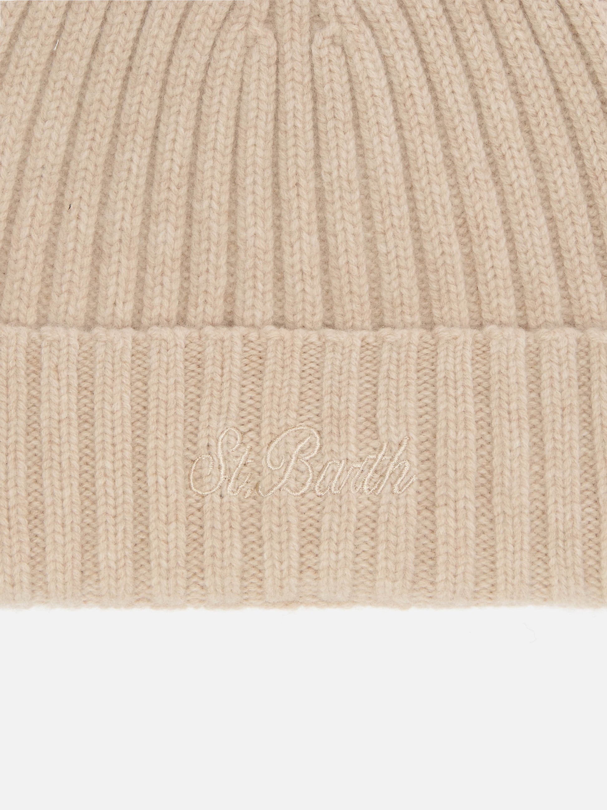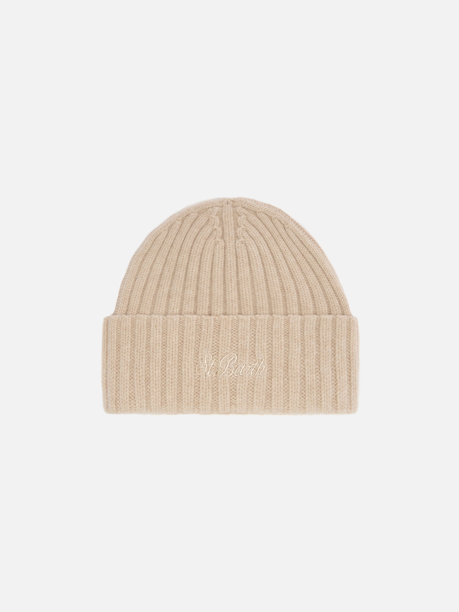 Berretto Wengen in lana beige con ricamo St. Barth sul risvolto