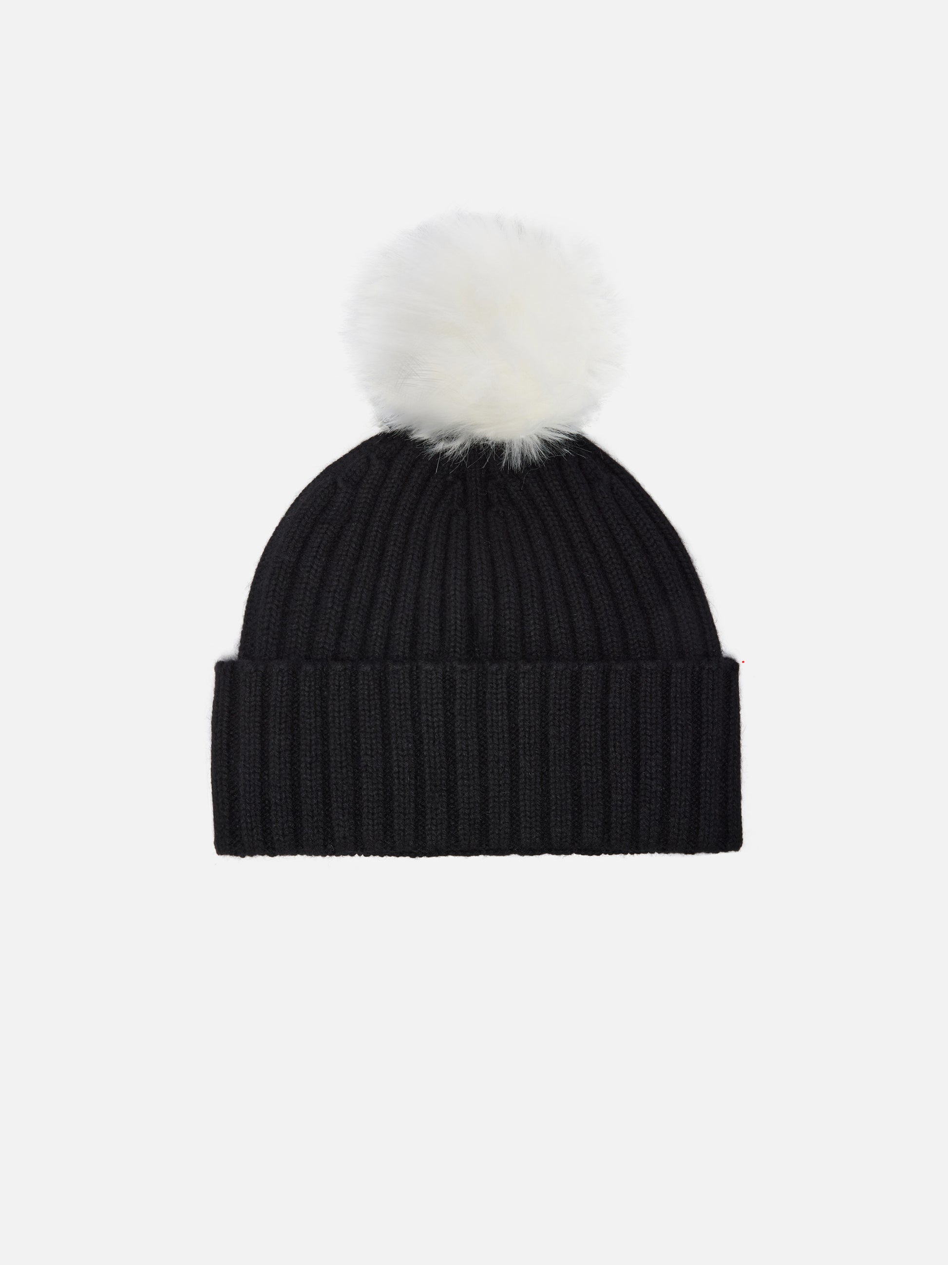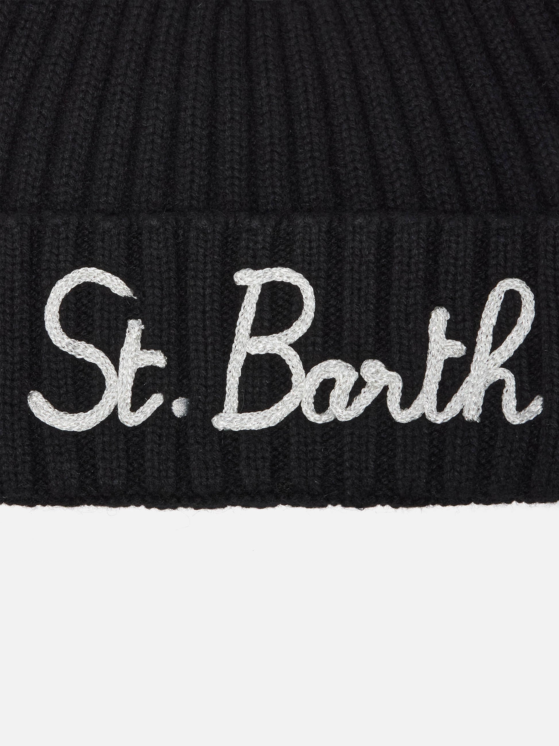 Berretto Wengen in misto cashmere nero con ricamo St. Barth e pompon