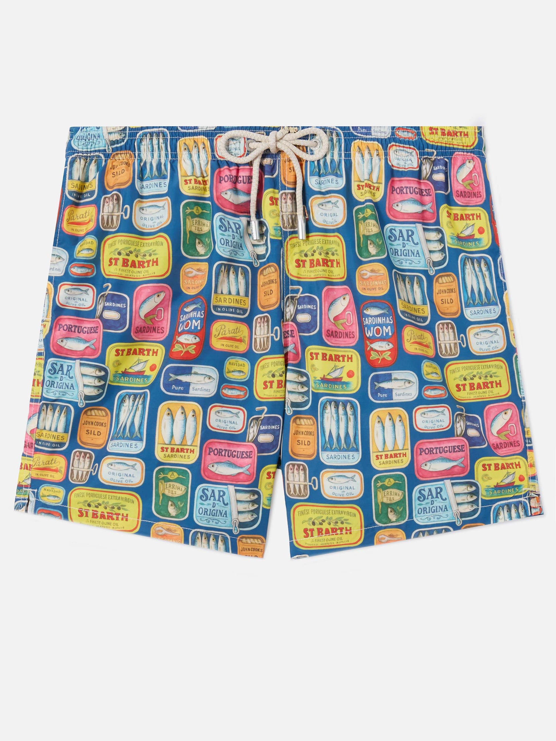 Blue Lighting swim shorts with all-over sardine tins print