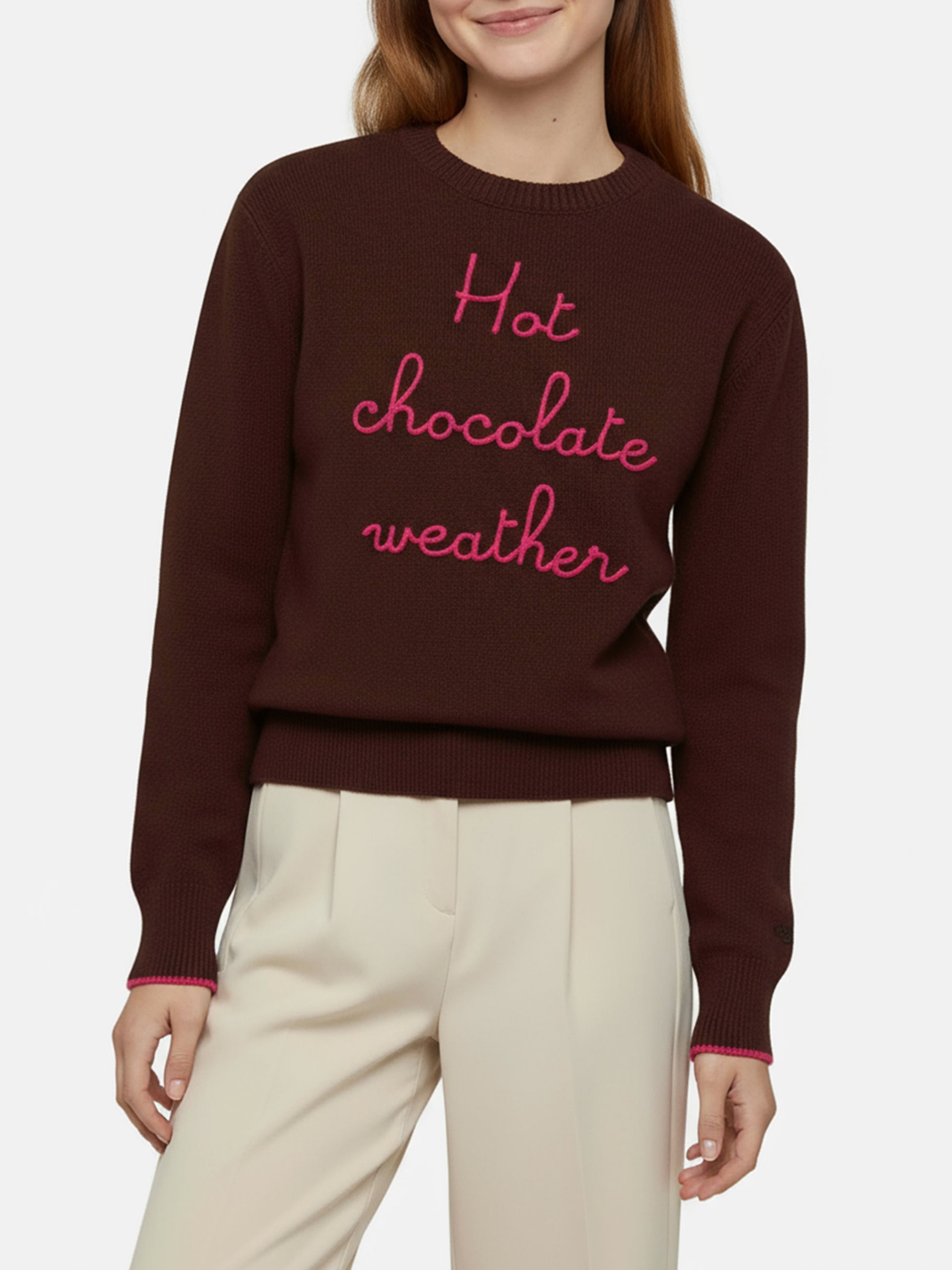 Brown sweater New Queen with Hot Chocolate Weather embroidery