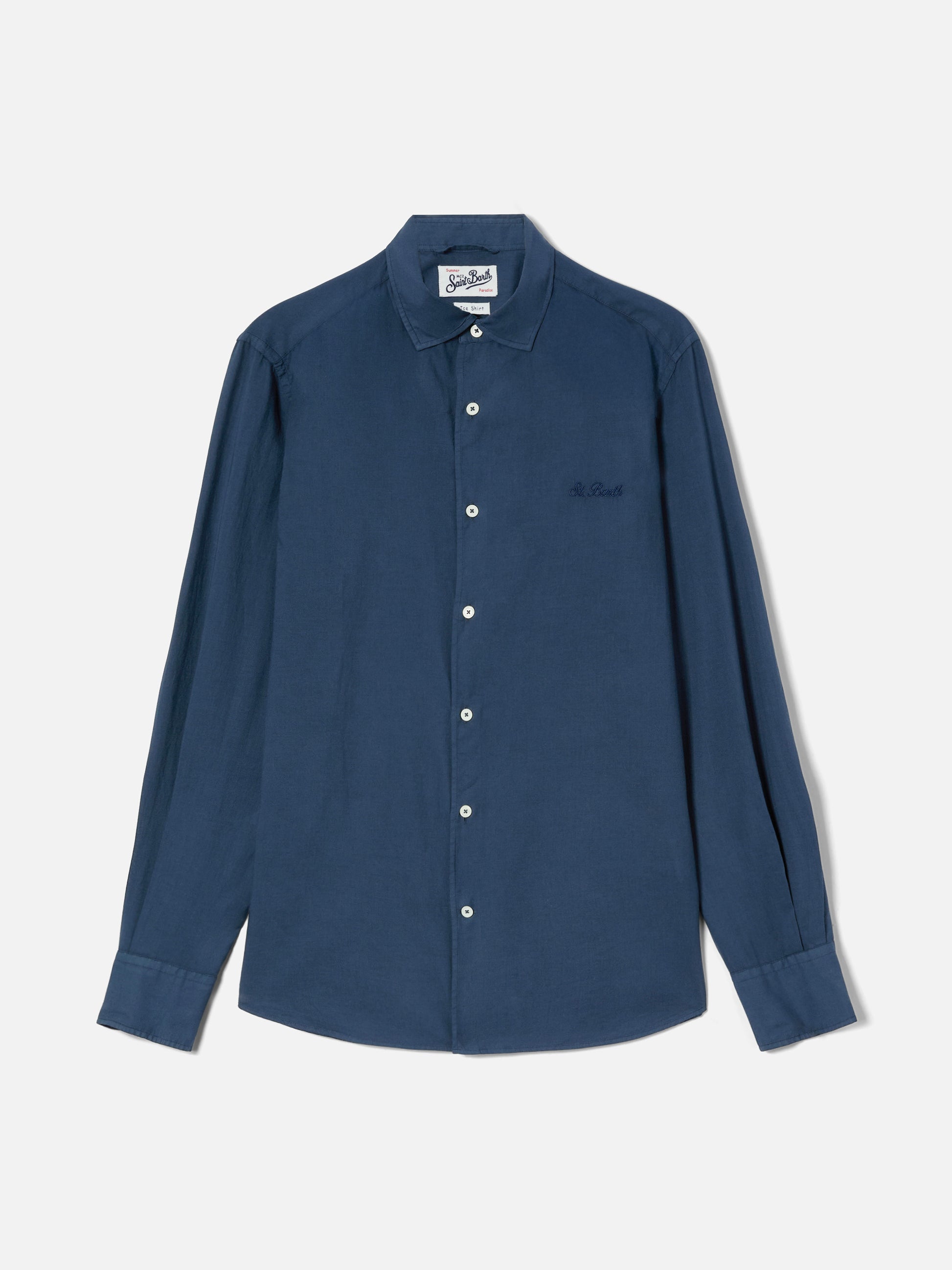 https://it.mc2saintbarth.com/products/navy-chemise-shirt-in-pure-cotton10780335112538Navy Chemise shirt in pure cotton129,00https:files/UID_LCM000100097L-MAN-SHIRT-BLUE-MC2-MC2_2.jpghttps:files/UID_LCM000100097L-MAN-SHIRT-BLUE-MC2-MC2_2.jpgEURInStockSHIRT650948215130All Products - Only Man649134276954AVADA - Best Sellers280529961144Man shirts672324452698New In - Man654689829210UpSelling_Man_ShirtThe Chemise shirt is crafted from pure cotton voile fabric, lightweight and breathable, designed to offer comfort and freshness. The garment features a navy blue solid color shade that enhances the essential aesthetic of the model. The design is completed by the tone-on-tone St. Barth embroidery on the chest. The model features a classic collar, front button closure with logo buttons and long sleeves. The fluid line ensures a comfortable and natural fit.