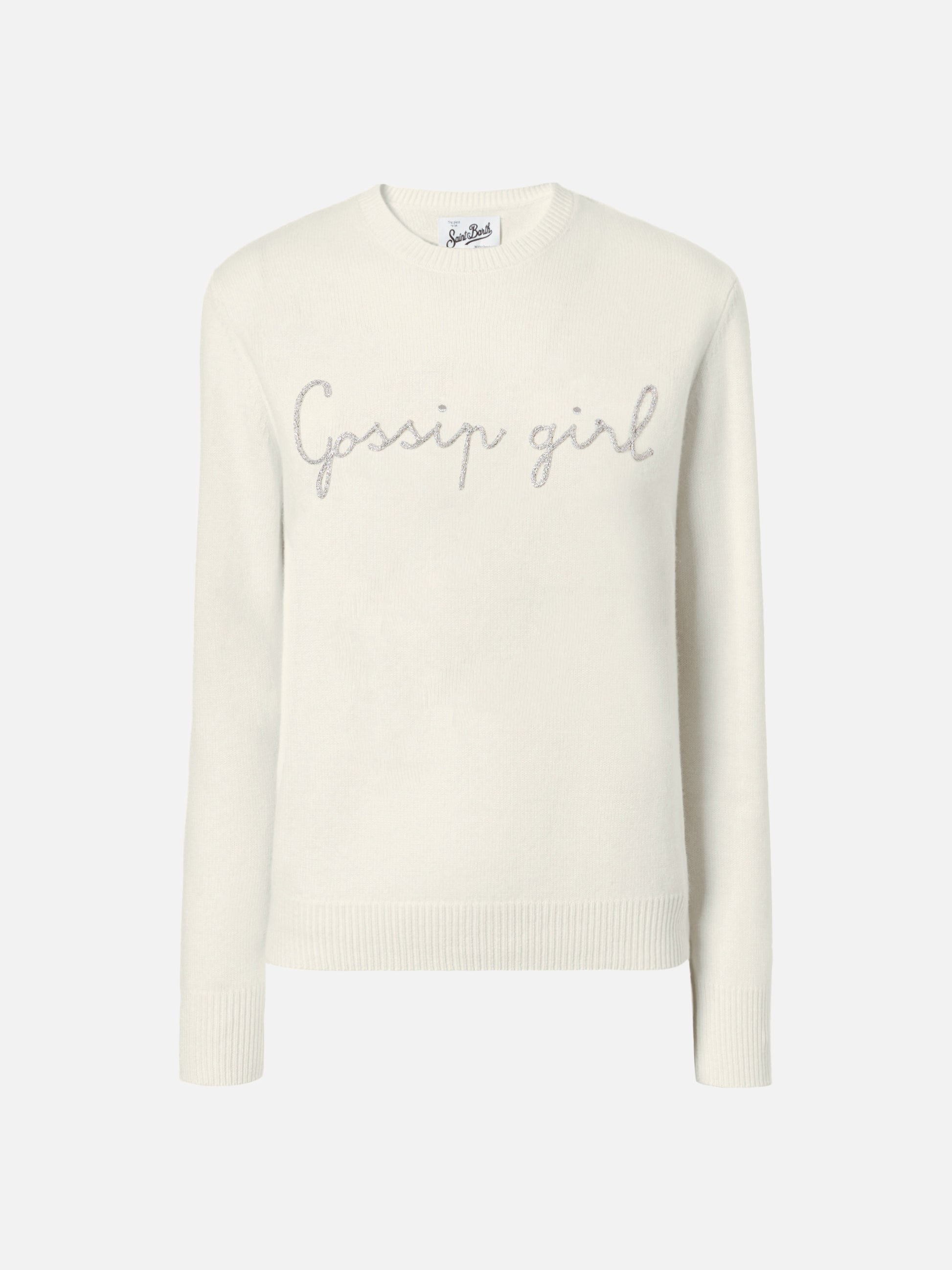 New Queen cashmere-blend sweater in white with Gossip Girl lurex embroidery